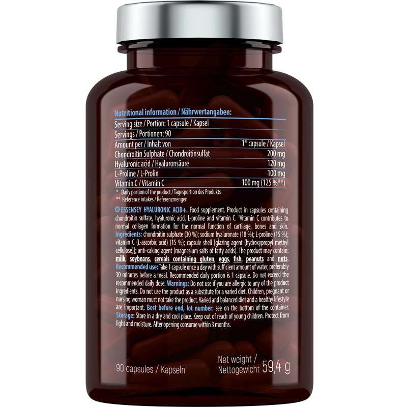 Sastojci: 30% siarčani hondroitin, 18% natrijum hialuronat, 15% L-prolina, 15% vitamin C (askorbinska kiselina), obloga kapsule [glazura (hidroksipropilmetilceluloza)], protivgrudna supstanca (magnezijumove soli masnih kiselina).